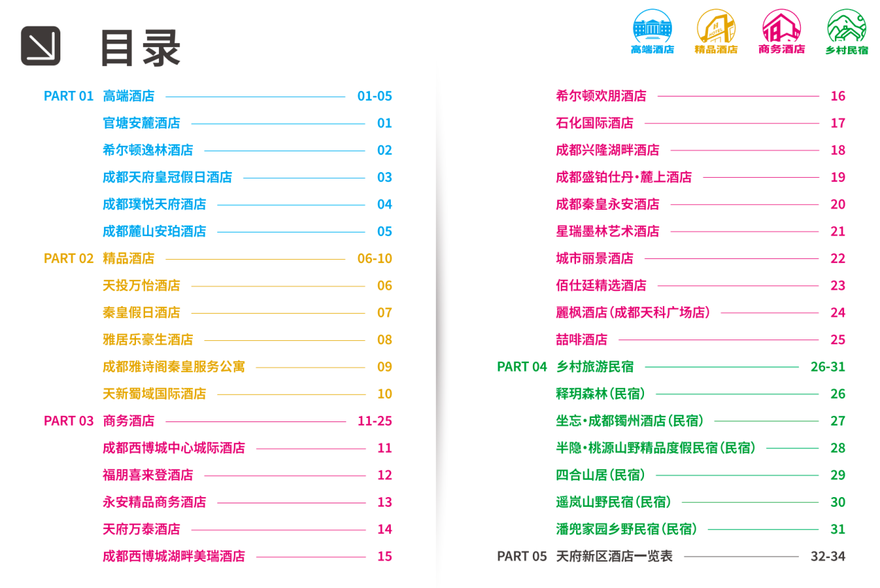 手册以 “出行需求” 为核心,将酒店清晰分为高端酒店、精品酒店、商务酒店、乡村旅游民宿四大板块,不管你是商务差旅、家庭度假,还是想躲进山野放松,都能快速找到适配选择: