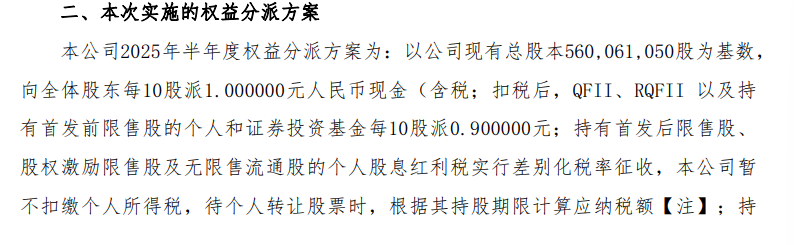 根据公告,齐峰新材以公司现有总股本5.60亿股为基数,向全体股东每10股派1元人民币现金(含税)。股权登记日为2025年9月16日,除权除息日为2025年9月17日。