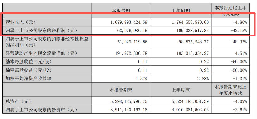 今年上半年,齐峰新材营收16.80亿元,同比减少4.80%;归属于上市公司股东的净利润6307.70万元,比起去年同期的1.09亿元,减少42.15%;加权平均净资产收益率1.57%,同比减少1.31个百分点。