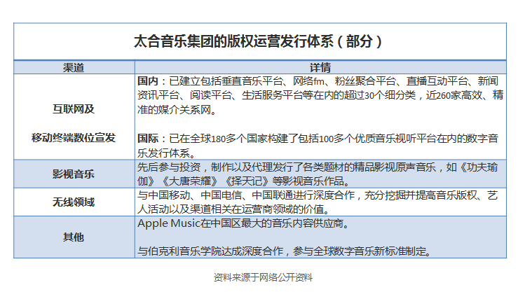 同时,相对于后起之秀(如互联网音乐公司),太合音乐也会更了解如何搭建并运营音乐内容体系及版权分发路径,直击内容公司与音乐人最迫切的需求。以版权运营发行服务为例,太合音乐集团的全球多渠道版权运营发行体系,不仅集音乐版权独家代理、授权发行、宣传推广等业务为一体,版权合作客户涵盖互联网、移动终端、游戏、视频、影视剧音乐、卡拉OK等诸多领域,地域还覆盖到中国、日本、韩国、新加坡、马来西亚、欧美等全球范围。