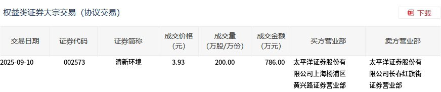 9月10日,清新环境大宗交易成交200万股,成交额786万元,占当日总成交额的15.29%,成交价3.93元,较市场收盘价4.08元折价3.68%。