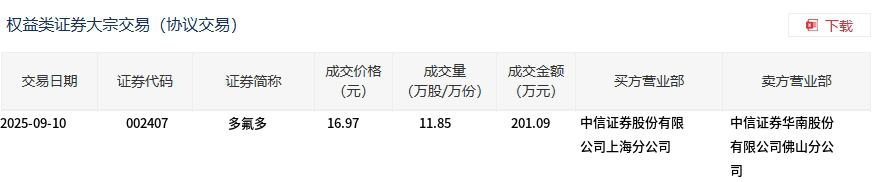 9月10日,多氟多大宗交易成交11.85万股,成交额201.09万元,占当日总成交额的0.05%,成交价16.97元,较市场收盘价16.97元持平。