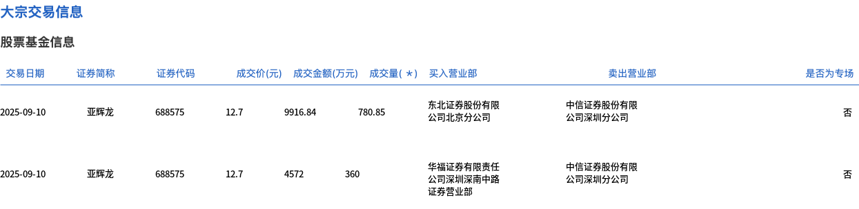 9月10日,亚辉龙大宗交易成交1140.85万股,成交额1.45亿元,占当日总成交额的75.65%,成交价12.7元,较市场收盘价15.15元折价16.17%。