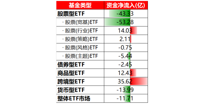 昨日,ETF市场整体资金净流出11.71亿元,市场延续谨慎情绪。具体资金流向上看,昨日大多数类型的股票型ETF现了较大的资金净流出,其中宽基ETF净流出超53.28亿,股票(行业)ETF和股票(策略)ETF呈现少量净流入,分别为14.03亿与2.11亿。跨境型ETF和商品型ETF延续昨日资金青睐,分别流入35.62亿与12.43亿。资金流动的特征一定程度上体现出风险分散和主题投资的市场倾向,或表明市场目前偏好风险资产。