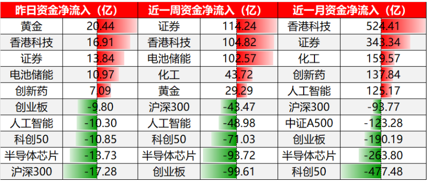 具体板块上,昨日黄金、香港科技、证券、电池储能和创新药资金净流入居前,创业板、人工智能、科创50、半导体芯片和沪深300资金净流出居前。其中,证券类型ETF的整体流入量呈现断层领先的态势。结合近一周与近一月的资金流入分析,香港科技与证券更受市场资金青睐,日、周、月三重时间维度资金流入均位居前列。