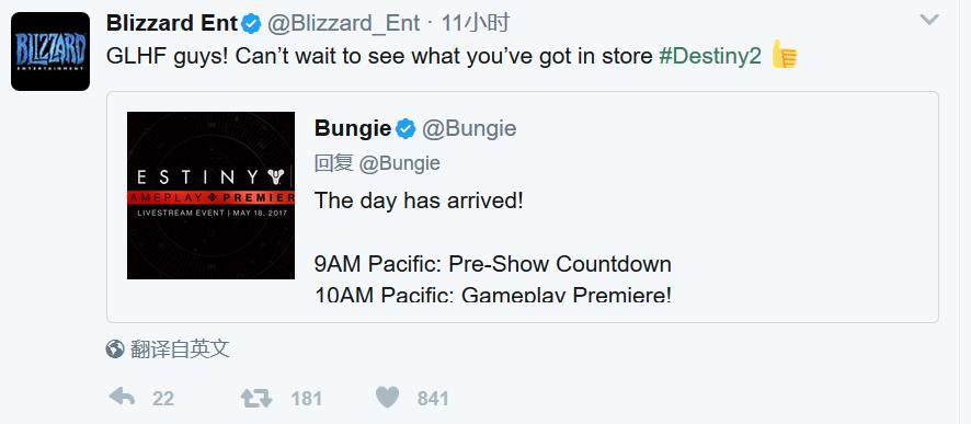 19日凌晨,暴雪官方账号@了Bungie工作室,“玩得高兴伙计们,等不及看到你们要秀出什么东西了!”附上的话题正是Bungie的新作《命运2》。
