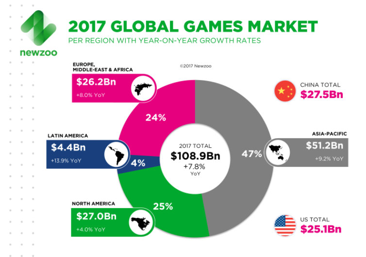 近日,市场研究公司Newzoo通过对全球游戏市场的预测,发布了2017年全球收入最高的游戏市场百强榜。到2017年,全球游戏市场将达1089亿美金,其中移动游戏市场规模将达457亿美金,占比为42%。其中中国(275.5亿美元)将是2017年全球游戏收入最高的国家,美国(250亿美元)、日本(125亿美元)、德国(43亿美元)、英国(42亿美元)分列在2-5名。以下手游那点事对TOP4规模的市场进行介绍: