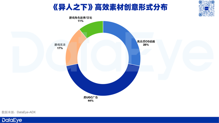 《异人之下》高效素材创意形式分布中,类UGC广告素材占比较多,其次则是高品质CG动画。