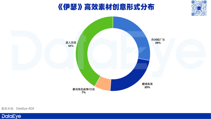 《伊瑟》高效素材创意形式分布中,真人实拍广告素材占比较多,其次则是类UGC广告素材。