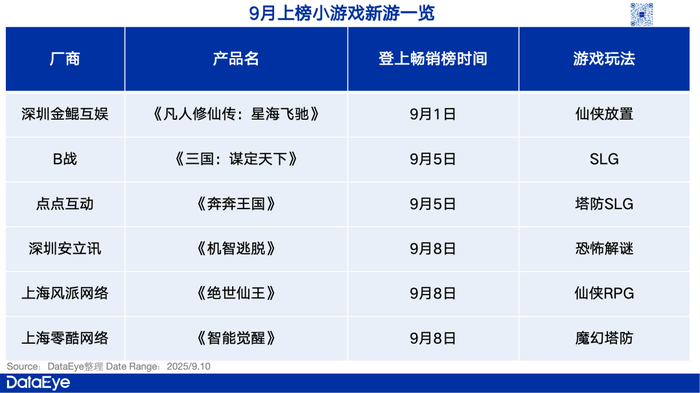小游戏赛道方面,截止至9月10日,新入榜(畅销榜)的小游戏,重点产品有B战《三国:谋定天下》、点点互动的《奔奔王国》。