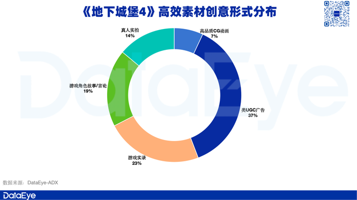 《地下城堡4》高效素材创意形式分布中,类UGC广告素材占比较多,其次则是游戏实录素材。