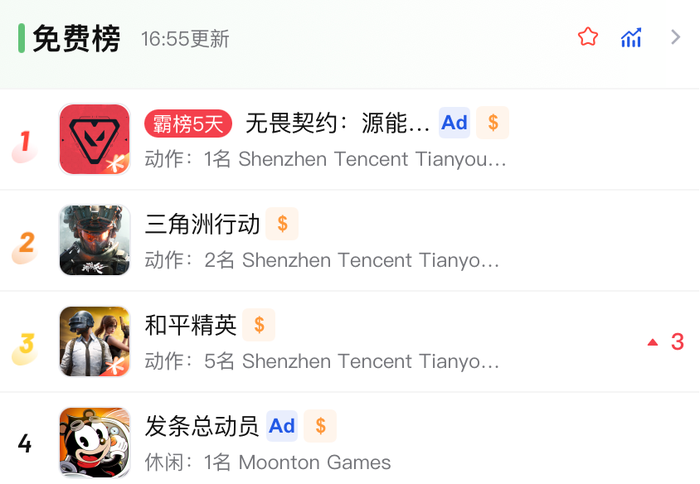 目前情况:当下iOS免费榜排名中,TOP4都是射击类游戏,其中腾讯有三款大DAU产品,且包含战术竞技、搜打撤、传统5V5等赛道;沐瞳有一款飞机弹幕射击手游。