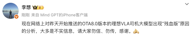 9月11日下午,理想汽车CEO李想在社交平台发文称,现在网络上对昨天开始推送的OTA8.0版本的理想VLA司机大模型出现“残血版”原因的分析,大多是不实信息。