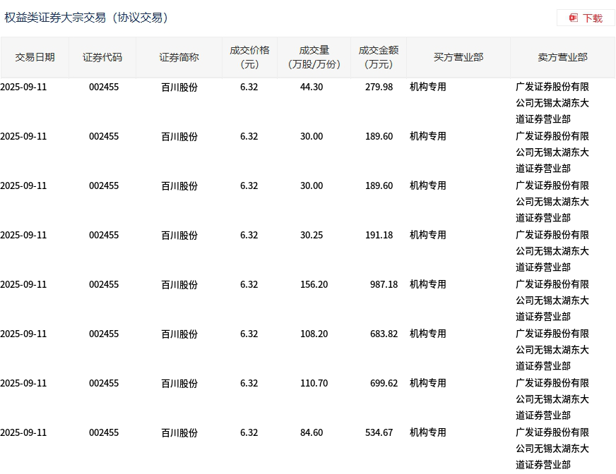 9月11日,百川股份大宗交易成交594.25万股,成交额3755.65万元,占当日总成交额的22.37%,成交价6.32元,较市场收盘价7.03元折价10.1%。