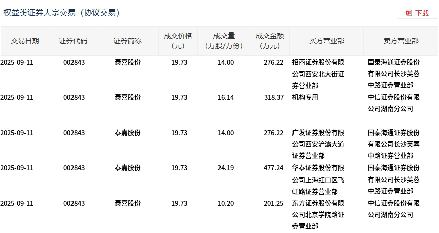 9月11日,泰嘉股份大宗交易成交78.53万股,成交额1549.3万元,占当日总成交额的3.57%,成交价19.73元,较市场收盘价23.58元折价16.33%。