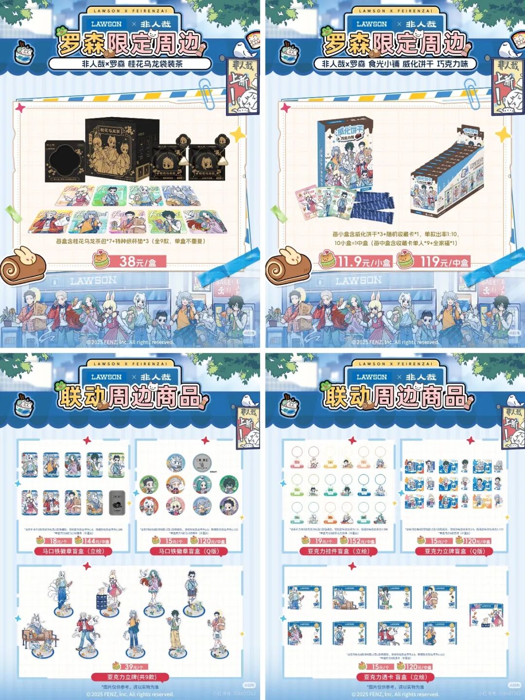 例如,上文提及的在产品及活动运营层面的具体执行策略,基本都是罗森进行IP联名的标配动作。以近期与热门国漫IP“非人哉”的合作为例,在9月8日至10月5日为期近1个月的合作中,罗森与“非人哉”合作在全新的柄图设计的基础上,推出了联名威化饼干、联名桂花乌龙茶等5款罗森限定周边,以及徽章盲盒、亚克力挂件等9款联动周边。在华北地区(京津冀鲁),罗森还将上线3款联名包装食品。