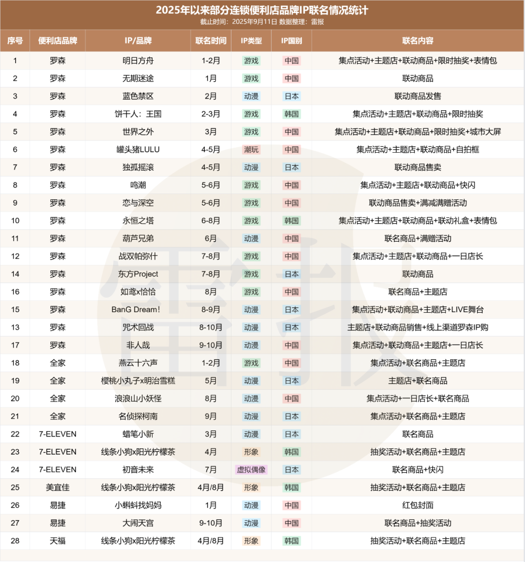 7-ELEVEn在中国则由不同公司运营,但与罗森有所区别,其在中国市场上其采取的策略更多是授权模式,且并未在中国设立总代,导致中国市场不同区域之间由不同代理方分别运营、各自为政。例如,雷报统计中7-ELEVEn今年的三场联名合作,并非像罗森那样在全国同步落地,这不可避免地导致联动规模和声势要小得多。