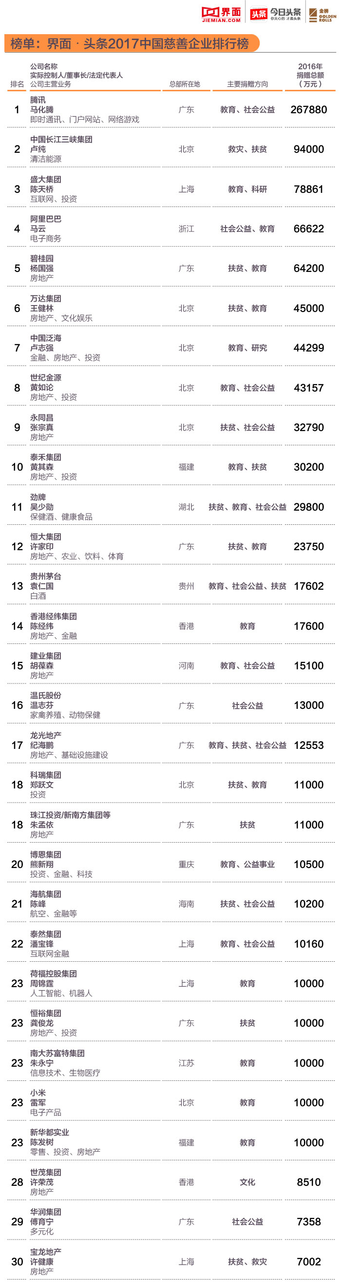 界面·头条2017中国慈善企业排行榜以在中国大陆运营或者主要业务在中国大陆地区的国有、民营、外资企业为考察对象,以其2016年落实的现金及股权捐赠为统计范围,来编制本榜单。在数据统计上,我们将企业主要管理层的个人名义捐赠亦计算在内。榜单数据主要来源于被调研企业,各慈善公益基金会,各地慈善总会等。