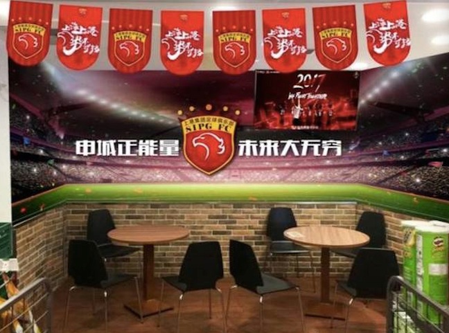 在上海陆家嘴最繁华的环球金融中心,一家大红色调的便利店刚刚开张,店员着红色球衣,店内充满了上港足球俱乐部红色色调的装饰和硬件,就餐区的墙面上也张贴了球场海报,除了常规售卖的零食饮料,在这家店还可以买到足球、球衣。