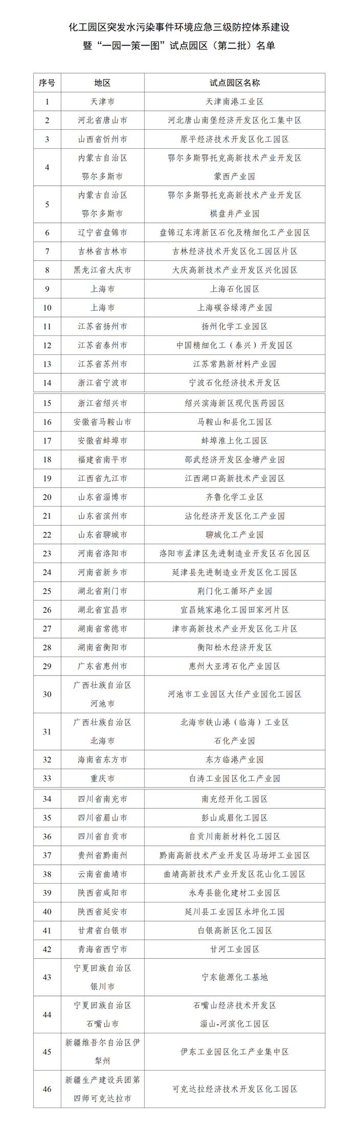 近期,生态环境部印发《关于公布化工园区突发水污染事件环境应急三级防控体系建设暨“一园一策一图”试点园区(第二批)名单的通知》,确定天津南港工业区等46个化工园区为第二批试点园区。