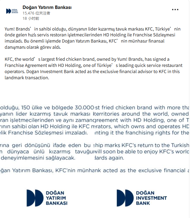 当地时间9月11日,担任肯德基顾问的Dogan Investment Bank在领英发布消息称,肯德基已与土耳其领先的快餐连锁企业HD Holding签署特许经营协议,该协议将允许HD Holding按照其品牌和标准在土耳其经营肯德基餐厅。