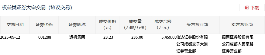 9月12日,运机集团大宗交易成交235万股,成交额5459.05万元,占当日总成交额的26.86%,成交价23.23元,较市场收盘价26.52元折价12.41%。