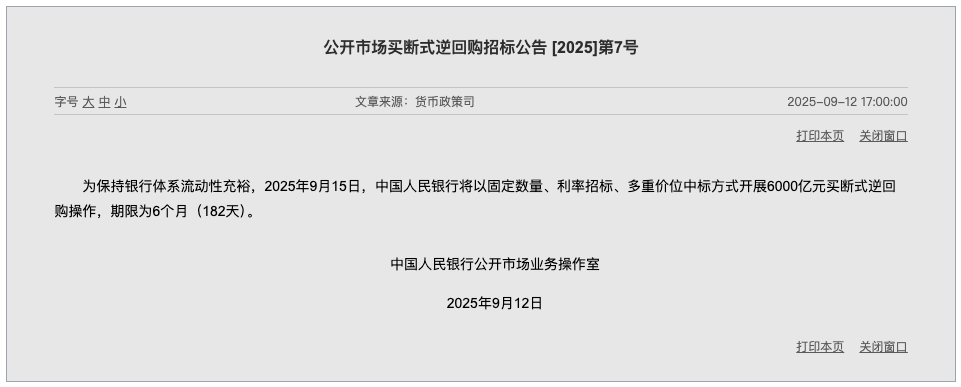 9月12日,据央行网站,为保持银行体系流动性充裕,2025年9月15日,中国人民银行将以固定数量、利率招标、多重价位中标方式开展6000亿元买断式逆回购操作,期限为6个月(182天)。