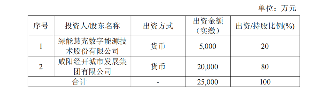 根据绿能慧充与咸阳经济技术开发区管理委员会签署的《绿能慧充咸阳研发及生产制造基地项目投资合同》《绿能慧充咸阳研发及生产制造基地项目补充合同》《绿能慧充咸阳研发及生产制造基地项目代建协议书》,拟与咸阳经开城市发展集团、咸阳经开实业有限责任公司签署《合作协议》,咸阳经开城市发展集团以货币方式实缴出资人民币2亿元,持股80%。
