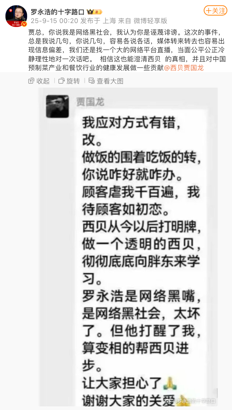 近日,西贝餐饮与罗永浩就预制菜引发的争论在网络上持续发酵。14日晚间,西贝创始人贾国龙此前表态的完整截图流出,其中除了提到西贝从今以后要打明牌、向胖东来学习外,还将罗永浩称为网络黑嘴、网络黑社会。对此,罗永浩今日凌晨在社交平台表示,本次事件中双方总是各说各话,媒体转来转去也容易出现信息偏差。他提议,双方找一个大型网络平台直播,当面对话。