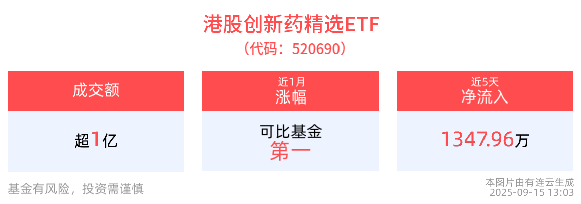 流动性方面,港股创新药精选ETF盘中换手27.79%,成交1.05亿元,市场交投活跃。拉长时间看,截至9月12日,港股创新药精选ETF近1周日均成交1.80亿元。