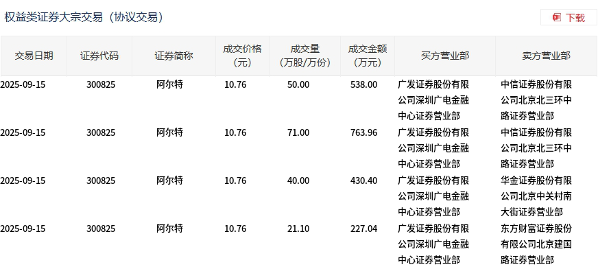 9月15日,阿尔特大宗交易成交182.1万股,成交额1959.4万元,占当日总成交额的9.09%,成交价10.76元,较市场收盘价11.81元折价8.89%。