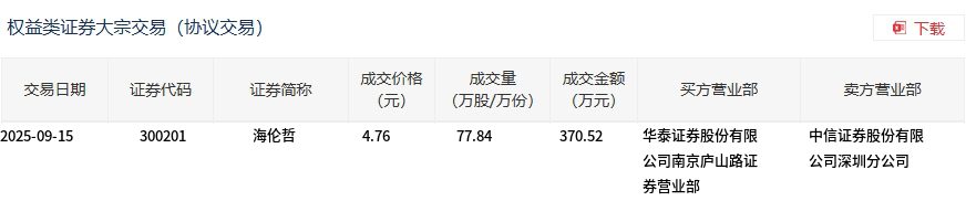 9月15日,海伦哲大宗交易成交77.84万股,成交额370.52万元,占当日总成交额的3.84%,成交价4.76元,较市场收盘价5.29元折价10.02%。