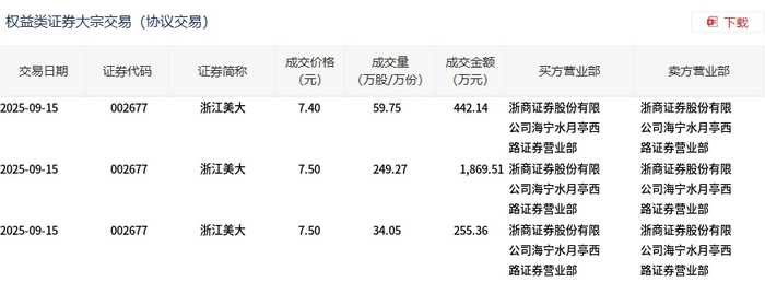 9月15日,浙江美大大宗交易成交343.07万股,成交额2567.01万元,占当日总成交额的46.65%,成交均价7.48元,较市场收盘价6.86元溢价9.07%,其中最高成交价7.5元,最低成交价7.4元。