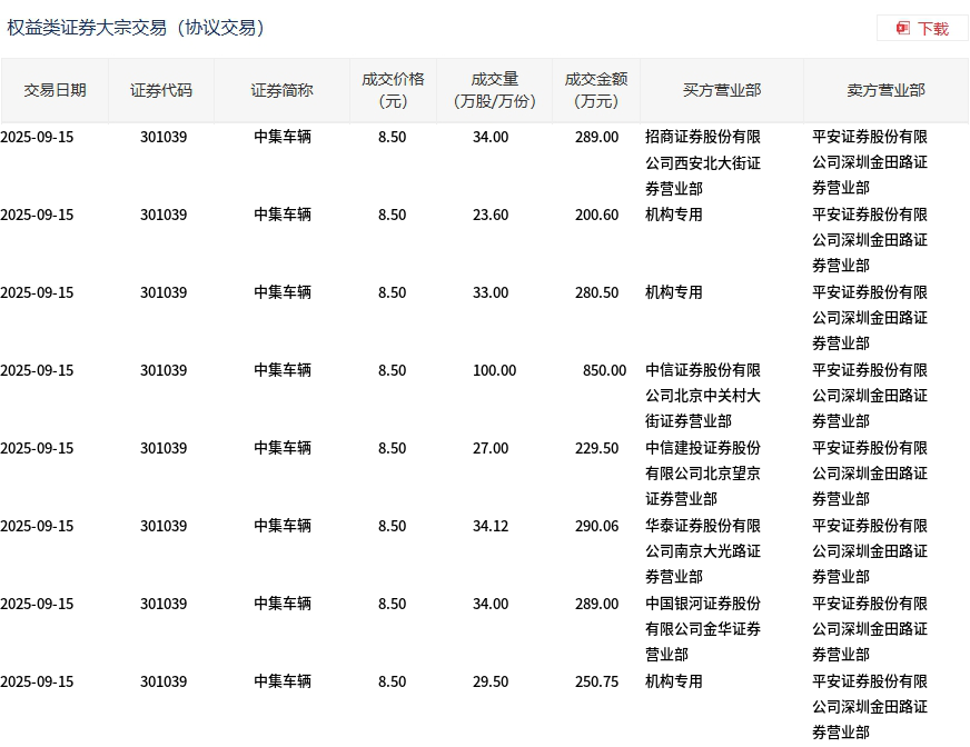 9月15日,中集车辆大宗交易成交315.22万股,成交额2679.41万元,占当日总成交额的13.67%,成交价8.5元,较市场收盘价9.47元折价10.24%。