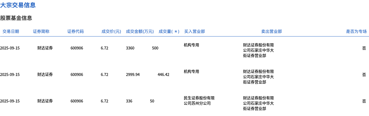 9月15日,财达证券大宗交易成交996.42万股,成交额6695.94万元,占当日总成交额的28.02%,成交价6.72元,较市场收盘价7.4元折价9.19%。