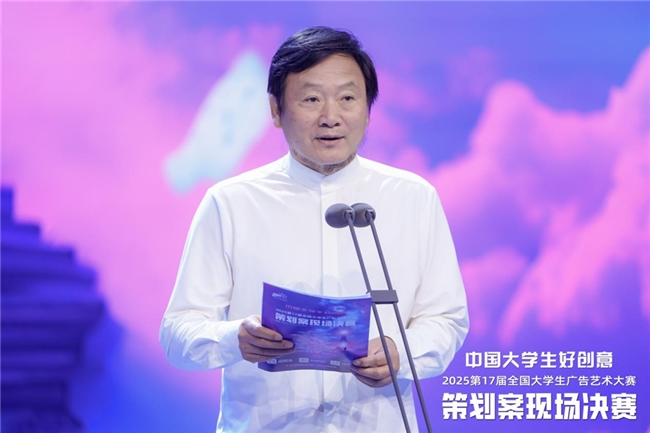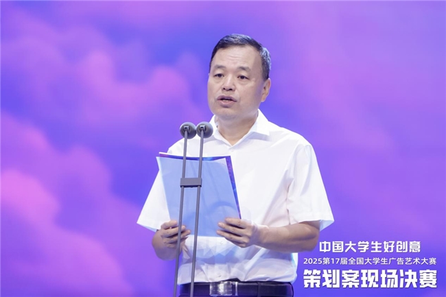 中国传媒大学校务委员会副主任陈作平教授发表讲话。他首先代表张树庭校长及中国传媒大学向评委专家、与会嘉宾及工作人员致以衷心感谢。陈教授指出,作为高等教育改革的重要实践,大广赛通过深化校企协同育人机制,有效助力学生专业技能提升,为行业输送专业人才与未来领军者。最后,陈作平教授表示中国传媒大学将继续发挥学科优势,深化合作搭建平台,与大广赛携手共推广告行业创新发展,并预祝本届策划案现场决赛圆满成功。