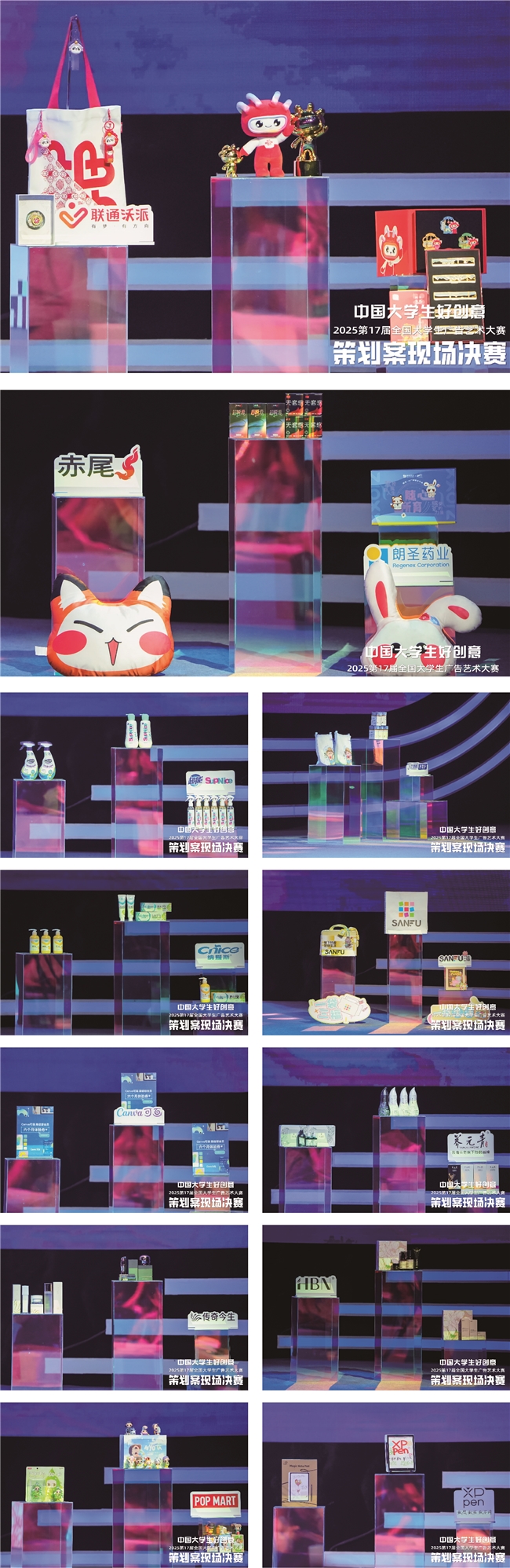 感谢到场的各位领导、评委、命题单位代表,感谢各位老师、参赛学生以及各位工作人员。感谢第17届大广赛首席合作品牌联通沃派、联合协办单位朗圣药业、命题:联通文创、赤尾、HBN、Canva可画、SANFU三福、传奇今生、XPPen、纳爱斯、超能SupNice、三九胃泰牌养胃舒、泡泡玛特、养元青、公益命题的大力支持。