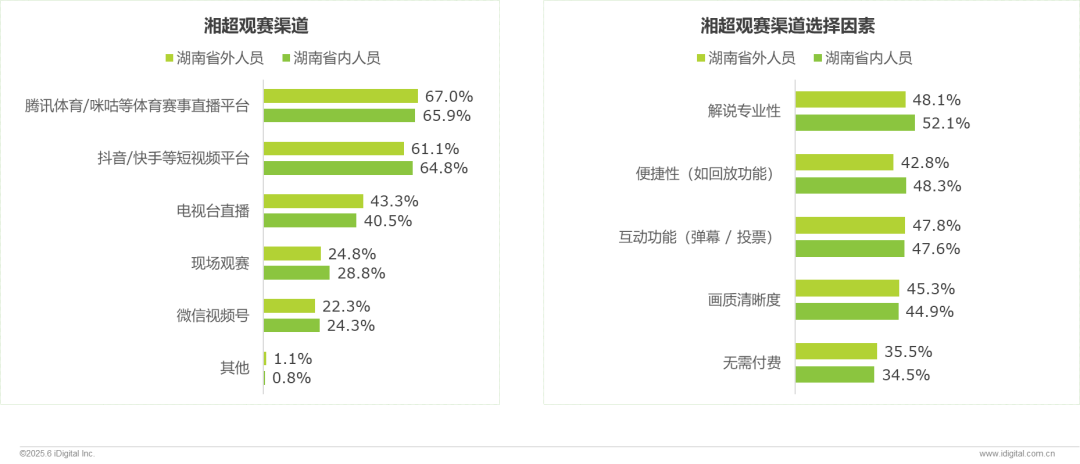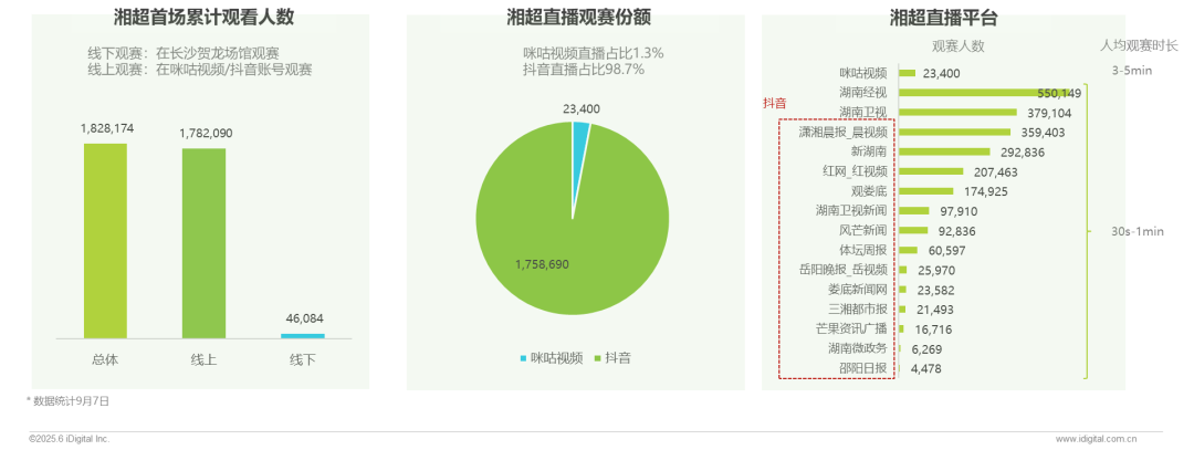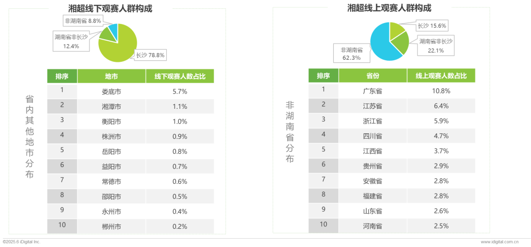 湘超观赛人群:线下场馆观赛4.0万人,主场优势明显(长沙占78%),其次是客场 (娄底占6%);线上直播观赛178.2万人,以抖音(近似占99%)为主要渠道且外省受众超六成。