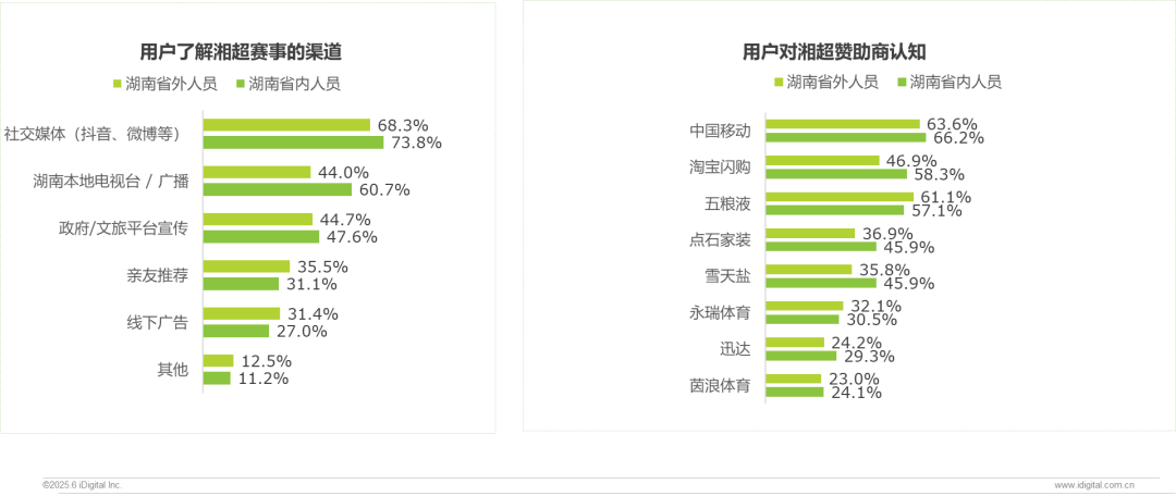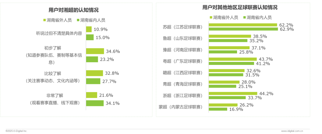 苏超(省外62.2%、省内62.9%)明显高于其他联赛、省内外认知度差距小,在湖南的传播“无显著地域偏向”