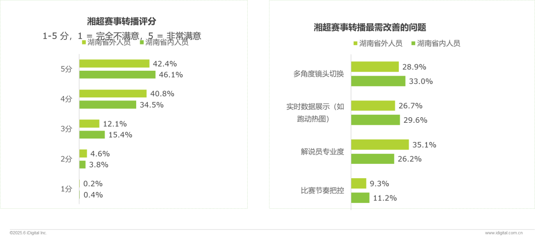 不同地域用户对“待优化方向”的优先级认知存在明显分歧;省外人员最关注“解说员专业度”(35.1%),其次是“多角度镜头切换”(28.9%)、“实时数据展示”(26.7%);省内人员最关注“多角度镜头切换”(33.0%),其次是“实时数据展示”(29.6%)、“解说员专业度”(26.2%)