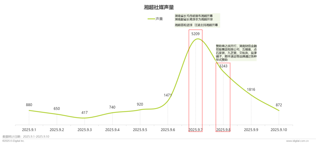 2025年9月1日至10日,湘超赛事社媒声量整体呈波动上升趋势,9月7日声量达到峰值5209,创近期最高纪录。该峰值主要源于湖南省长毛伟明宣布开幕、副省长蒋涤非开球、首粒进球及汪涵主持等事件叠加,引发全网高度关注。其余日期声量保持活跃,如9月8日因多品牌赞助活动推动声量至1816,反映湘超赛事具备较强的社交传播影响力。