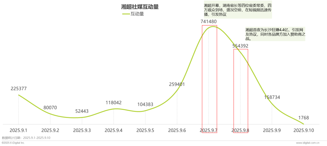 2025年9月1日至10日湘超联赛社媒互动量呈阶段性爆发特征,9月7日达峰值741480,为区间最高值,较前日(9月6日)环比激增186%,当日,湖南省长毛伟明宣布湘超开幕、副省长隋涤非为湘超开球、四万观众到达现场观赛且赞助商之战打响等事件,使得众多网友关注评论,推动社媒互动量飙升。