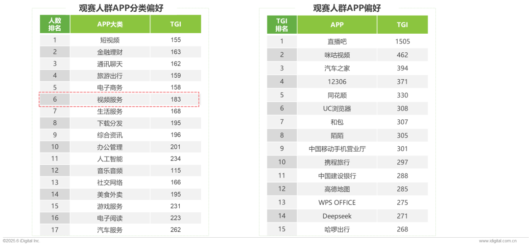 除因观赛产生的咪咕视频、抖音、移动等平台的显著使用外,在视频服务、人工智能(Deepseek)、汽车服务类(汽车之家)及出行类APP(12306、携程旅行、高德地图)同样表现出明显偏好,呈现“观赛核心+ 兴趣延伸”特征