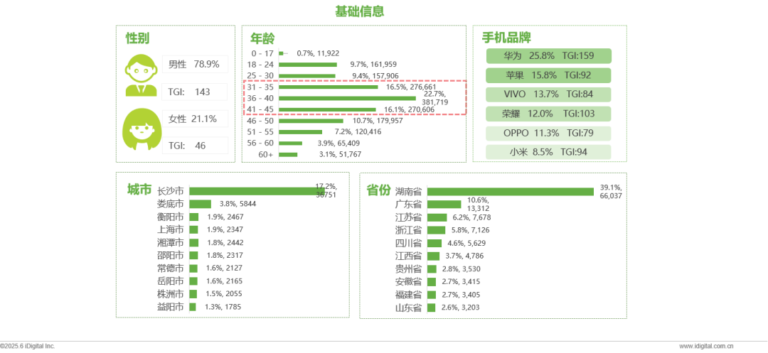 观赛人群基础画像:整体呈现“男性主导、中年核心主力、聚焦本土人群”特征;性别上男性占主导(79%,TGI139),年龄以31-45岁群体和核心(55%,TGI150),同时地域主要以湖南省内地市观众显著性突出。