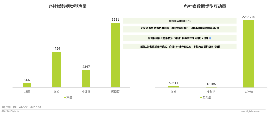 2025年9月1日至10日湘超赛事社媒传播中,短视频成为核心传播渠道,声量达8581,互动量高达2,234770,远超微博(声量4724、互动量50,614)和小红书(声量2347、互动量10,706),其高占比源于短视频对赛事高光(如开幕式、进球瞬间)碎片化呈现符合用户消费习惯,展现湘超在年轻群体中的高关注度与传播渗透力。