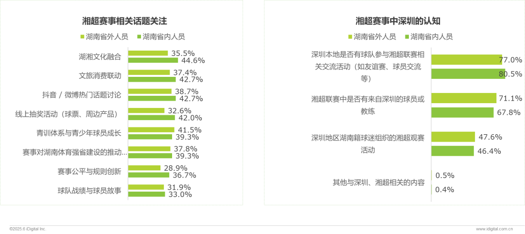 湖南省内人员对“湖湘文化融合”(44.6%)、“文旅消费联动”(42.7%)的关注最高,仅“青训体系与青少年球员成长”话题,湖南省外人员关注比例(41.5%)略高于省内人员(39.3%),其他话题湖南省内人员均高于省外人员