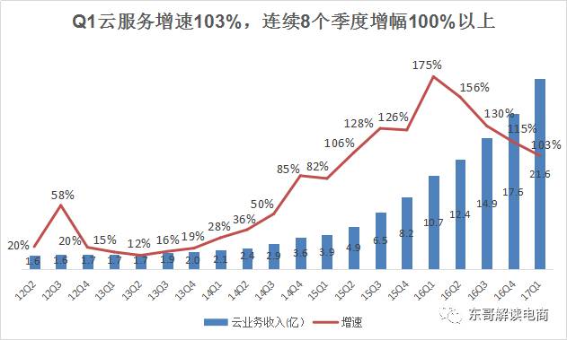 由于云服务行业都处在不断降价的环境中,因此我们可以推测推动客单价上涨的因素是用户使用量的提高。云服务已经被证明未来将是一个数千亿的市场,而阿里云具有毋庸置疑领导地位,未来想象空间巨大,也是支撑阿里市值最重要的部分。