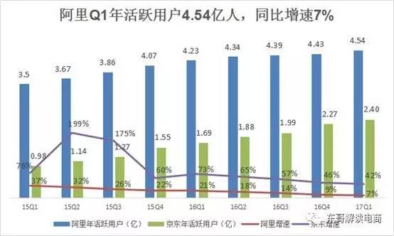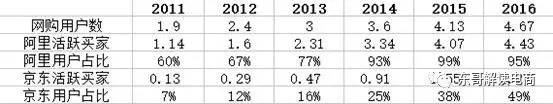 如果看季报数据,趋势就更加明显。阿里2016年第四季度(自然年季报)净增长才400万,同比增速只有9%,而15年的每个季度净增长都在1500万以上。反观京东的用户指标,2016年Q4净增长2700万,此前Q3净增长了1100万,Q2净增长2000万,Q1净增长2800万。