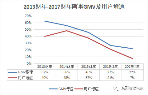 阿里巴巴零售业务基数已经很大,所以22%的同比增长已算是不错了。但根据阿里巴巴历年数据,GMV增速应该与用户增速趋于一致,比如说2016财年用户同比增速为21%,而GMV增速为27%,也就是说2017财年同比增速应该低于10%,而不是22%。