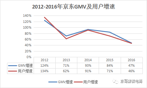 京东2012年到2016年的数据,用户增速和GMV增速基本保持一致性。京东老用户的人均消费额一直在快速增长,而新用户的消费能力较低,最终拉低了人均消费额。